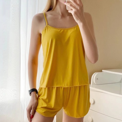 Yellow Women Sexy Satin Pajamas Sets Short Sling Top with Cami Shorts